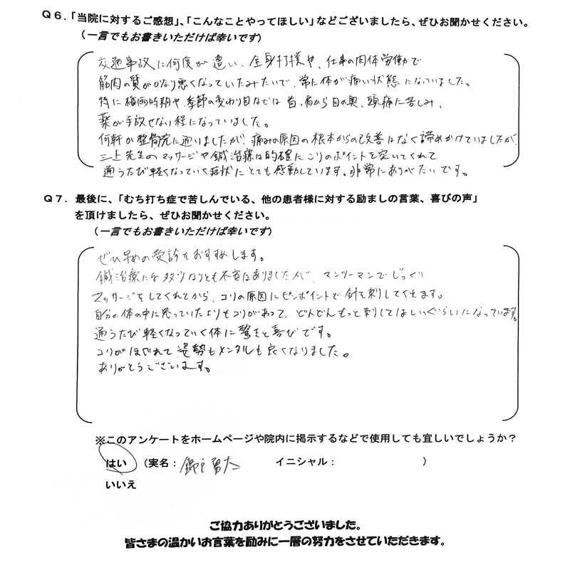 何軒か整骨院に通いましたが、痛みの原因が分からず、根本からの改善ができなくて、つらい症状を諦めかけていましたが、三上先生のマッサージや鍼治療は的確にこりのポイントを突いてくれて、通うたび軽くなっていく症状にとても感動しています。非常にありがたいです。