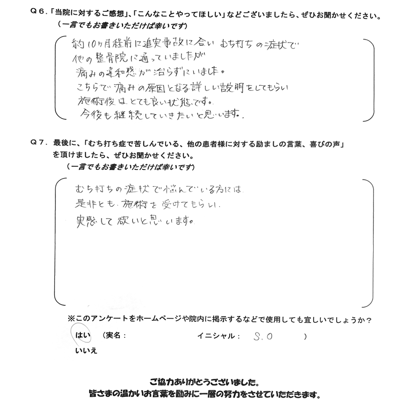 「むち打ちの症状」で悩んでいる方には 是非とも受けてもらい実感して欲しいと思います。(S.O様)