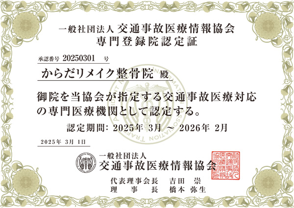 当院は、交通事故治療に関する高い技術と豊富な知識・経験が認められ、東北で唯一『交通事故医療情報協会』より『交通事故治療の専門家』として認定されています。