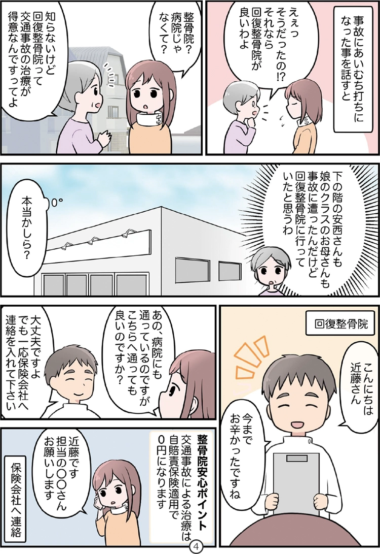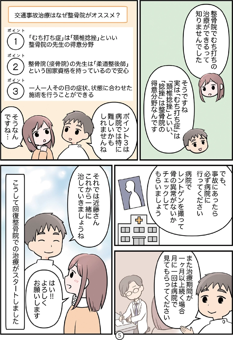 整骨院は国が認めた国家資格を有する柔道整復師、鍼灸師が施術を行う機関ですので、自賠責保険を使った治療が可能です。また、通院日数に対して慰謝料は支払われます。