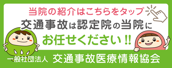 当院は「一般社団法人 交通事故医療情報協会」に交通事故のむち打ち治療等に適切に対応できる院として認定され、サイトで紹介されています。